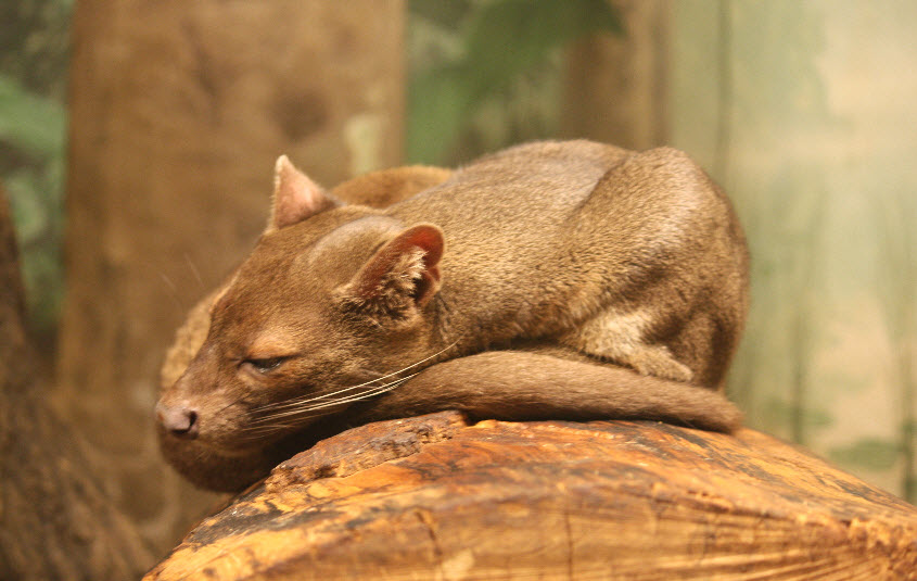Animal You | Fossa | The generic name is Cryptoprocta like anus anal animal hides from his pocket, from the ancient Greek words Crypto "hidden" meaning procta "anus". The ferox species name is the Latin adjective "hard" or "wild. Their common name in English or pit grave written in Malagasy, the Austronesian language which was removed, but some authors have adopted the English spelling Malagasy. posed for the cat in Borneo, while in Madagascar could be the word pit, remove the pit, the pit was officially opened by Edward Turner Bennett describes based on a sample of Madagascar in 1833 by Charles Telfair Posted. per common physical features with the owls, mongooses and cats (Felidae) has questioned its classification. compact skull, large dark circles to get claws and teeth of specialized predators have also led some taxonomists associated with cats. In 1993, François Catzeflis Géraldine Veron and study DNA hybridization, which means that the well was more closely related to mongooses ( Herpestidae family) compared to cats and owls posted suggests. To reflect this relationship, all Malagasy carnivores are now Inside a family Eupleridae. Eupleridae, the mine with the subfamily Euplerinae falanouc (Eupleres goudoti) and Malagasy civet down, but their exact relationships are not well resolved.